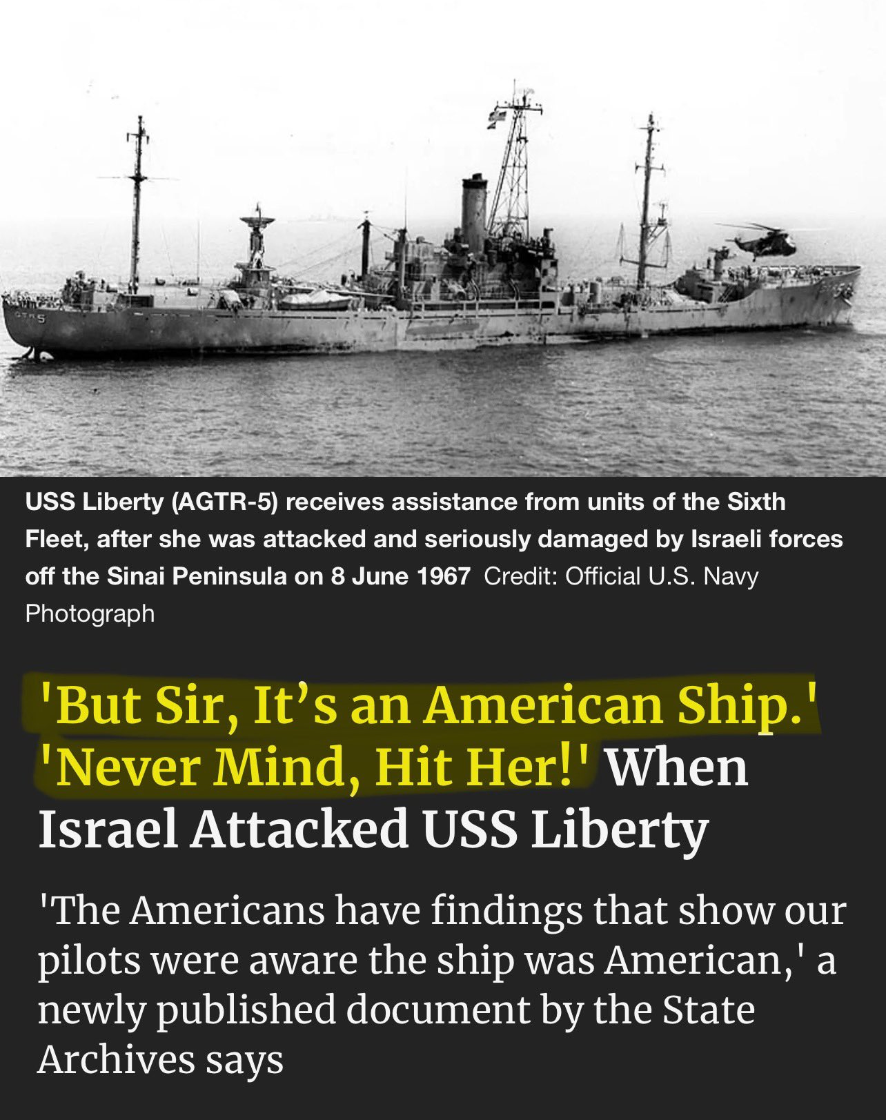 On June 8, 1967, during the 6-Day War, Israel attacked the USS Liberty with unmarked planes and torpedo boats, killing 34 sailors and injuring 121 more. Israel knew it was a U.S. ship, and attacked it anyway. The U.S. government and its corporate media lackeys have spent 55 years covering up the truth of this incident. There is no recognition or memorial to those who were deliberately murdered. Why was the USS Liberty attacked? It likely intercepted radio communications of the Israeli mass execution of unarmed Egyptian POWs.