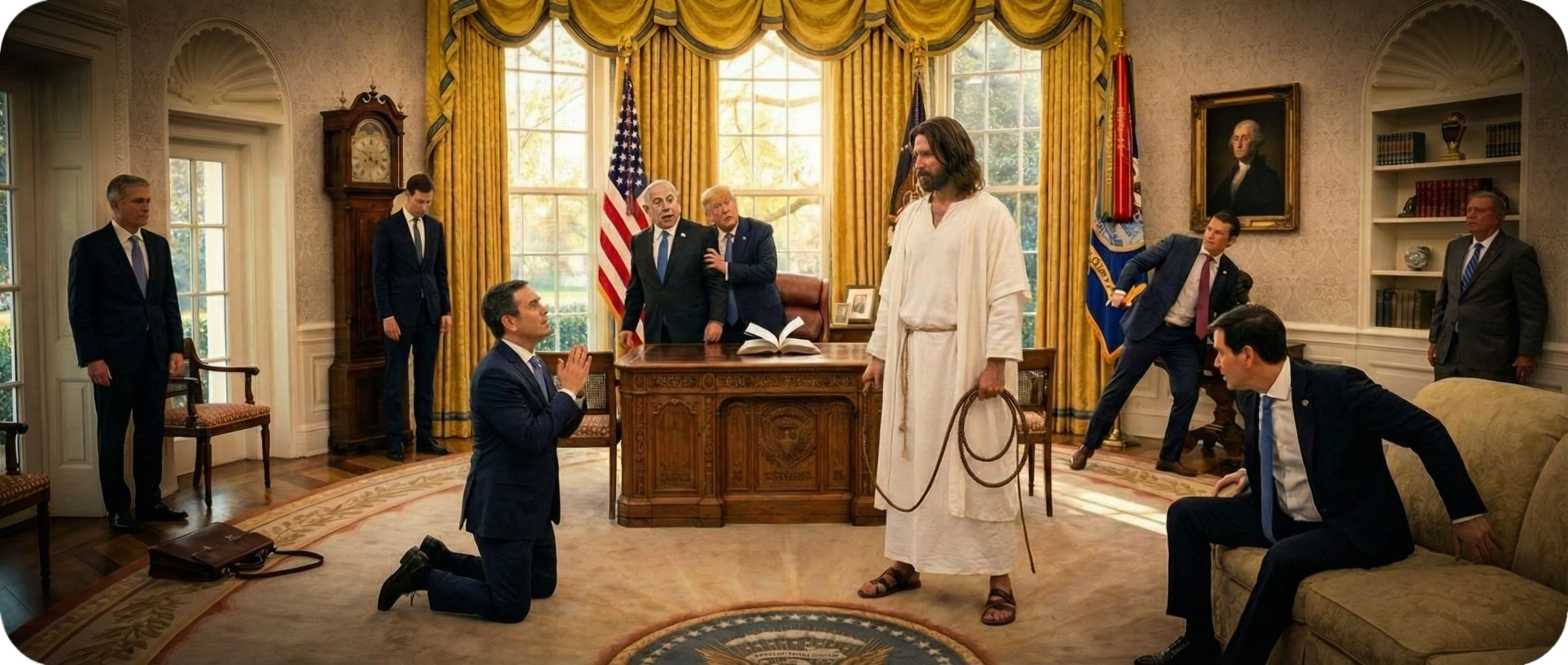 New Rome memos delivered. War for armageddon confirmed. Antichrist among earthlings. Speculation around levels of Botox received or McDonaldβs consumed. The Orange suspect confessed he is not going to heaven. Refused to put his hand on a copy of War and Peace at his inauguration. No Bible in sight.