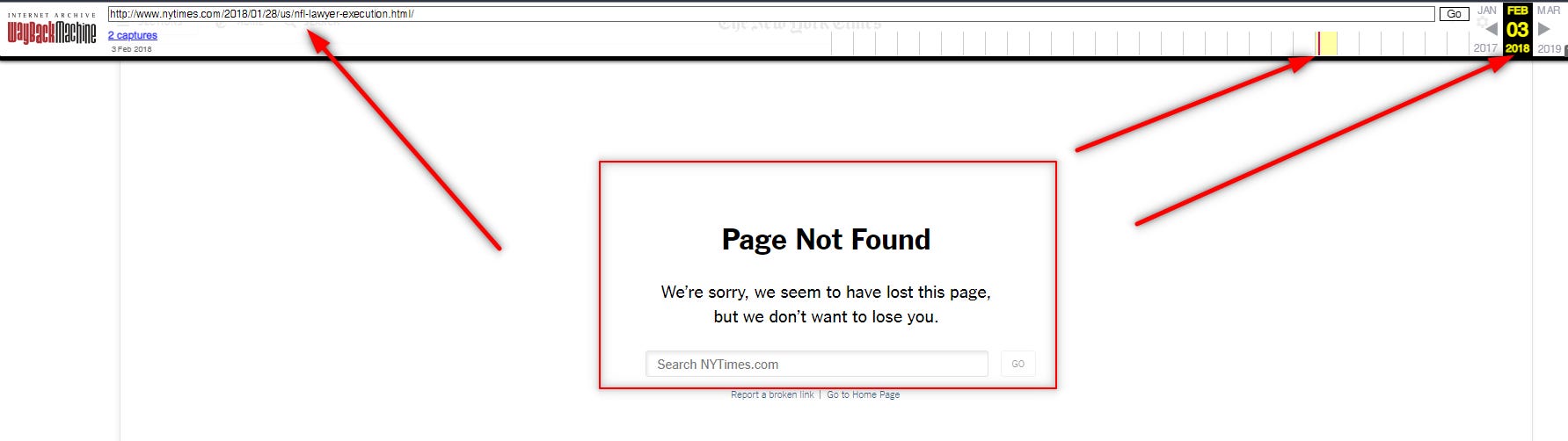 The NFL is so powerful that they were able to delete it from the Internet, all search engine results, and even the Internet Archive page which captured the New York Times article on February 3, 2018, but for some mysterious reason β€œlost” those two instances of capturing that URL: https://www.nytimes.com/2018/01/28/us/nfl-lawyer-execution.html