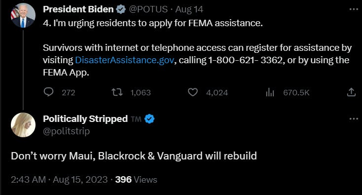The sooner any valuable American property turns to ash and dust the sooner insurance companies can rip off property owners, and benevolent Billionaires like Oprah and Data Zuckerberg can swoop in and add to their thousand-acre portfolios of ancient sacred Hawaiian lands.