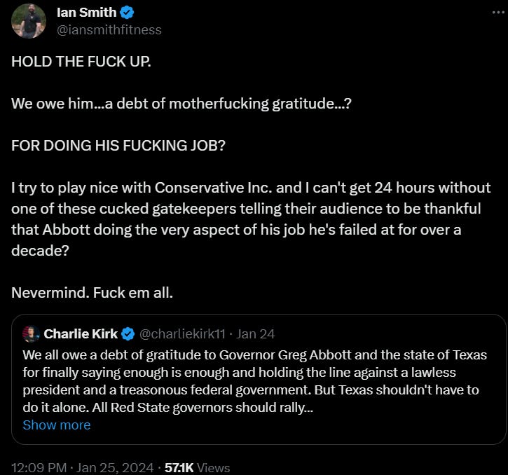 Thanking Governor Abbott for doing his job on a mile of fencing across a 1254-mile border is like thanking the French for fortifying their border with Germany while ignoring their border with Belgium between the World Wars. Kirk could have just said, “Thanks for keeping the invasion going while pretending to do something about it and giving me something to grift on my podcast today that will help the red team.”
