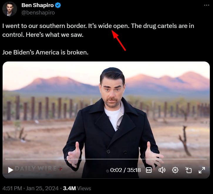 But don’t fret Good Citizens because The Daily Fire of Con Inc. is on the case. Benny Shapiro is currently doing a series on “Biden’s” border invasion.
