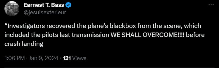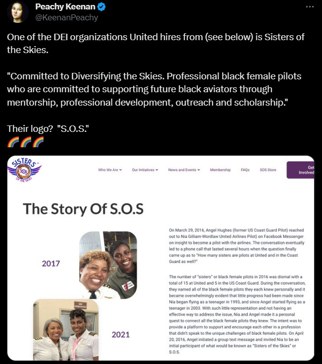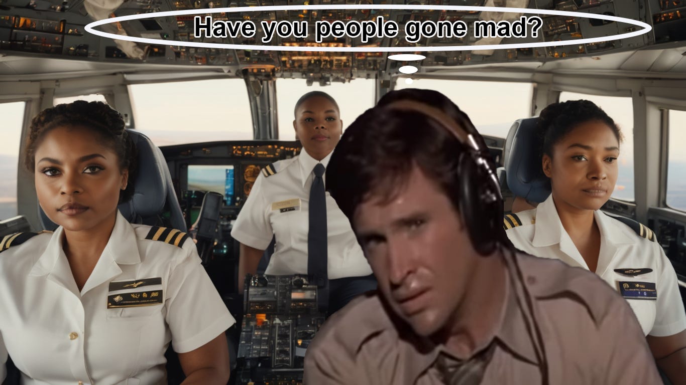 Falling from the sky the passengers last thoughts were, "Good thing they were quadruple-vaxxed Latinx Lesbian pilots or it could have been so much worse."