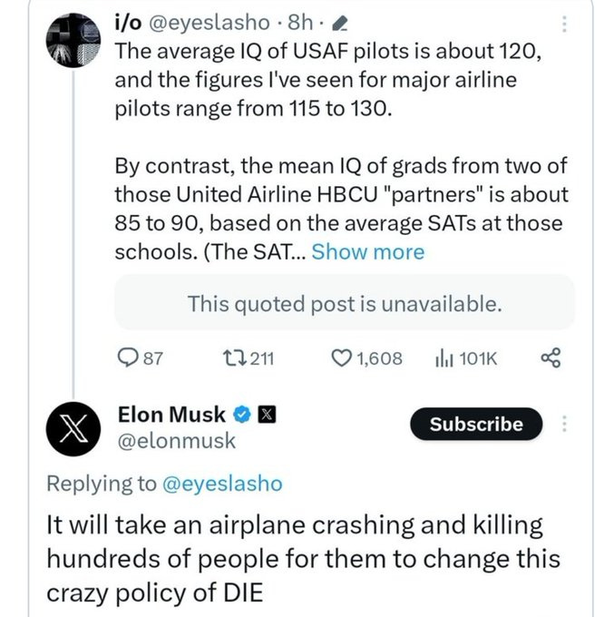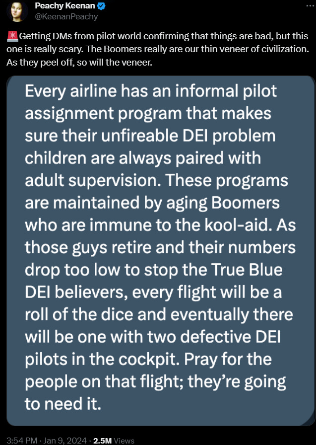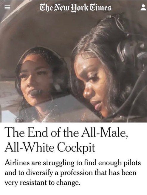 I swear the first Airline that openly and actively ditches DIE policies, increases Pilot salaries and says in their ads that they only hire for all positions based on merit will be the first trillion-dollar airline by market capitalization. People will be fighting to pay premiums for middle seats near the lavatory on twelve-hour TransPacific legs.