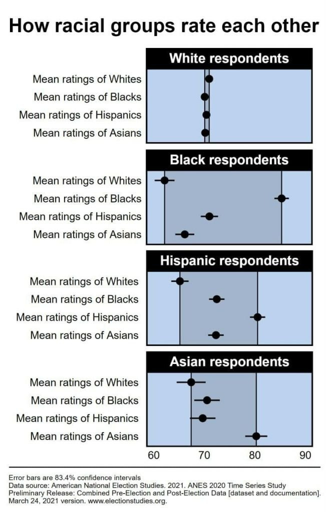 Whites in America being the least racist have been exploited for decades for their tolerance (or stupidity?) in tolerating… racism against them. All other races think highly of their race, and less of other races, and these sacred minority groups that whites decided deserve preferential treatment (out of collective historical guilt) are much more racist than whites. Statistically speaking, whites aren’t racist at all.