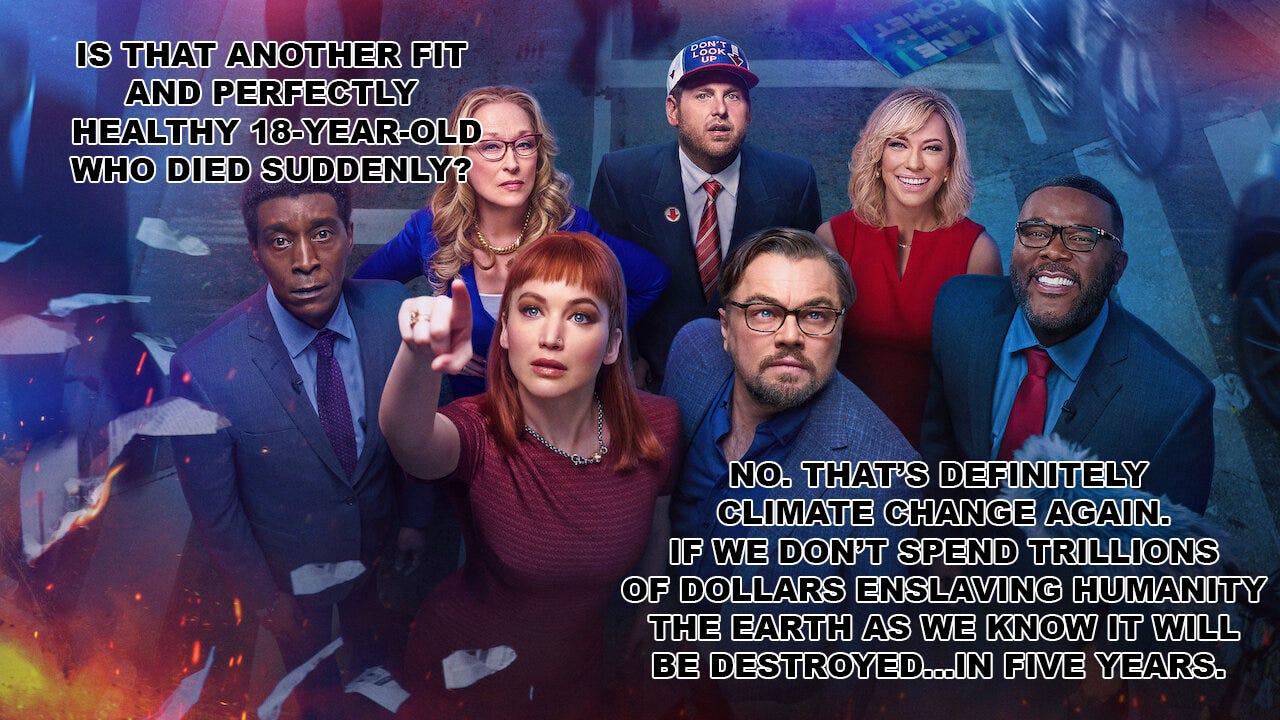 In the terrible Wokeflix movie “climate change” is represented as a metaphorical asteroid on an imminent collision with Earth, and the solution offered by the orange man supporters is to simply ignore it by not looking up and hope it doesn’t destroy us.