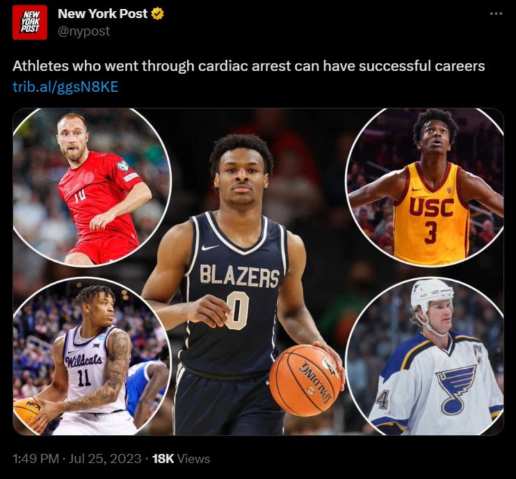 Yesterday Lebron James’ son Bronny had a heart attack while practicing with his new team at USC. The normalization of fit young men collapsing by the thousands every year from sudden coincidences is sickening.