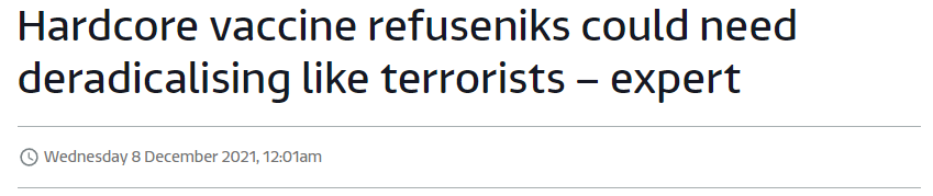 Get ready in Britain for a “de-radicalization” program for citizens wanting to exercise bodily autonomy and have the freedom to asses personal risks and make decisions that should be between them, their brain, their ability to research and think critically and their GP, preferably someone who isn’t a complete whore for Big Pharma. The entire piece is an exercise in mass projection. It’s not the vaccinated who are in a cult, but the hardcore vaccine refuseniks.