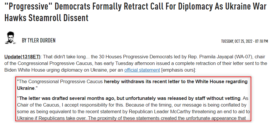 Even the low-IQ βprogressiveβ caucus that dared write a letter to Biden to push for a negotiated settlement in Ukraine got the memo from Globopsycho and immediately rolled over today like good little obedient servants.