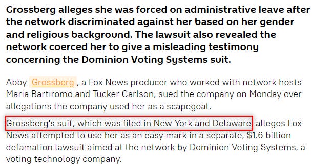 Was the Dominion settlement a ‘two-part’ deal to close the Grossberg “discrimination ” case by firing Tucker Carlson (and Bongino?) and including an undisclosed payout to Grossberg for wrongful termination?