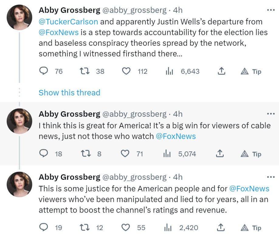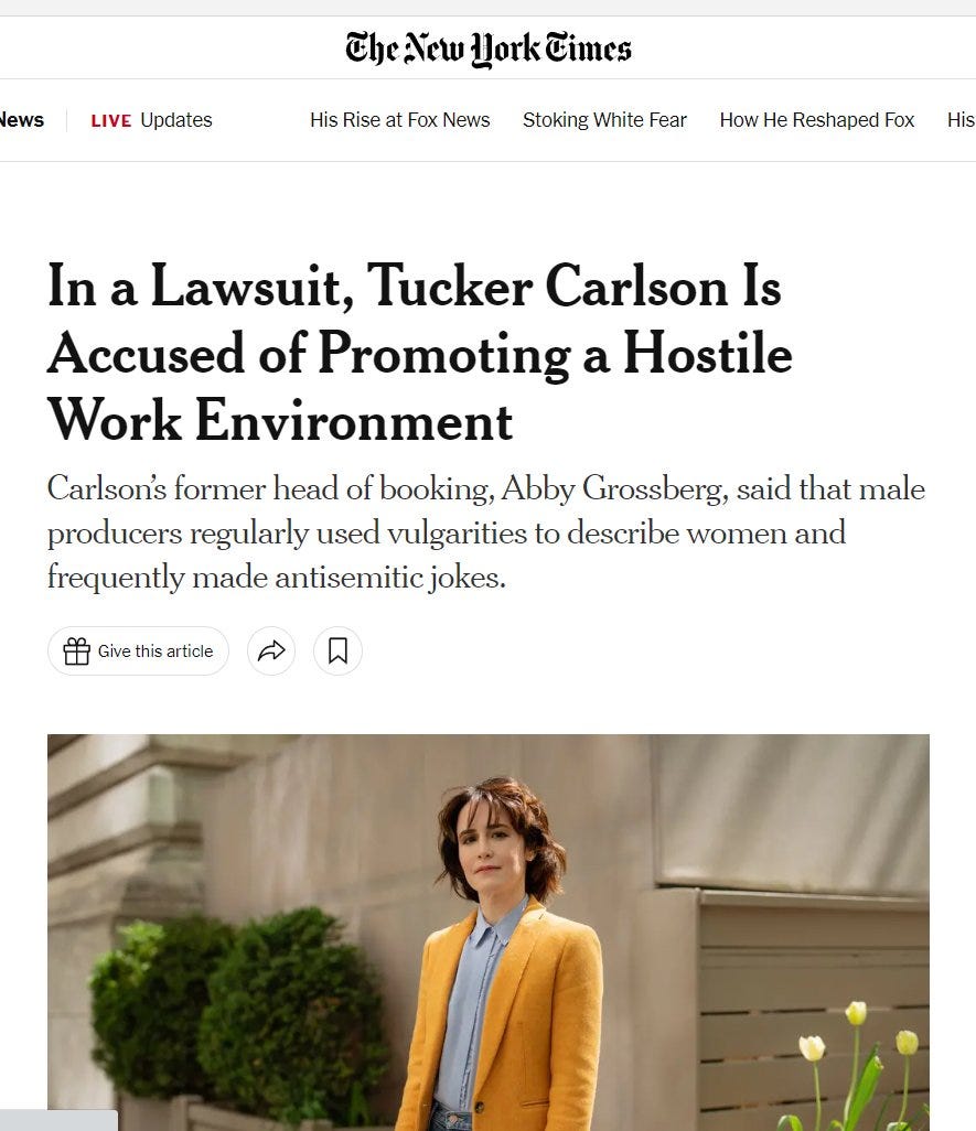 For weeks the CIA’s mockingbird news networks promoted Abby Grossberg’s case against Fox News. The latest appearance by her lawyer came over the weekend just as Fox News Honchos planned to “part ways” with Tucker Carlson. Her lawyer specializes in wrongful termination and discrimination suits.