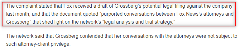 The exact timeline of events is murky, but Grossberg was put on administrative leave and at some point she hired a wrongful termination attorney and filed suit against Fox News and Tucker Carlson Tonight producers claiming “discrimination” and harassment in the workplace including “misogyny and anti-semitism.” Because of course, the show preferred by white supremacist right-wing conspiracy theorists would be full of raging misogynists and anti-semites.