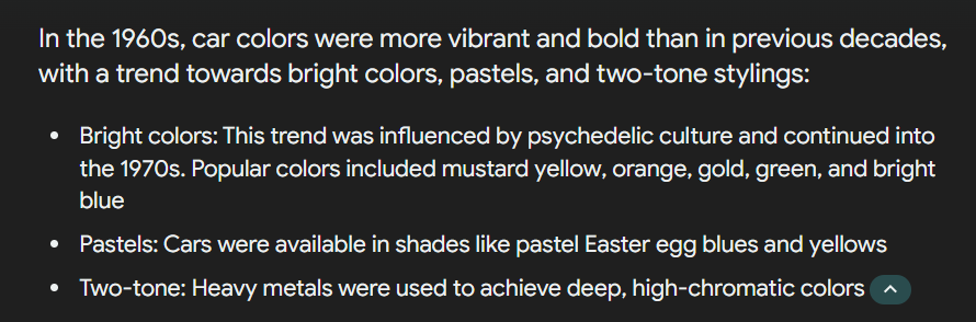 By the 1950s vibrant colors were introduced to all brands of automobiles, including soft pastels of green, yellow, and pink. The most popular selling cars were not associated with the monochrome palette.