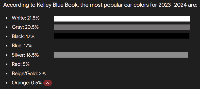 The past year of color choices in car sales were all on the monochrome spectrum, including white, gray, black, and silver, accounting for 76% of total sales in the United States. With shades of blue-gray, and dark blue that can often appear black, the total monochrome figure pushes toward 90% of all car sales.