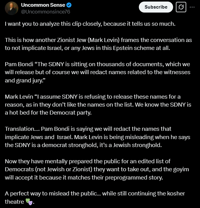Perhaps the "national security risk" posed from the release of the "Epstein files" would be what the general public would do if they knew that Epstein was still alive. When our country has been hijacked by jews, the greatest threat to our "national security" is the truth.