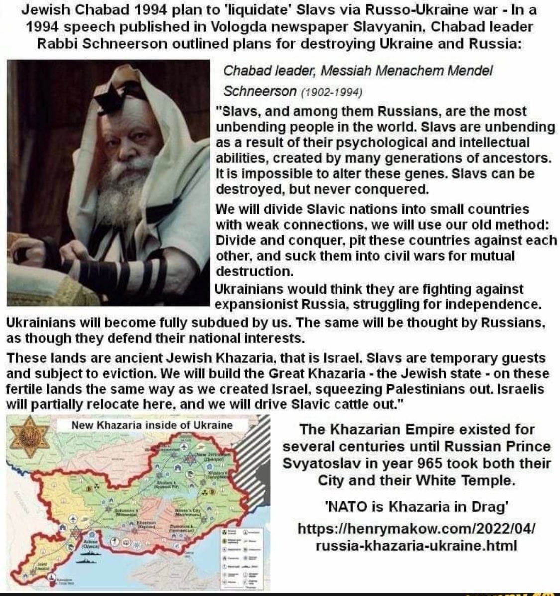 As for the Slavs of Ukraine and Russia, the operation for obliteration has been long in the works with the Chabad cult in the United Statesโ head Schneerson (who magically escaped Nazi capture a year after his father-in-law) making shockingly accurate predictions in the 1990s about dividing Slavic nations.