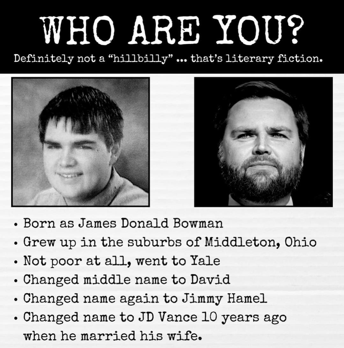 Oh wait. He was never a hillbilly. That was all part of his premanufactured selection biography psyop, just like Obamaโs.