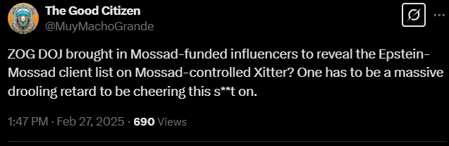 Three actors with IMDB pages, two jewish and one hillbilly performed for jewish controlled media to bury the previous dayโs debacle of parading Mossad-funded Con Inc. influencer idiots around with Epstein binders filled with fully redacted nonsense or flight logs that have been on the Internet for years.