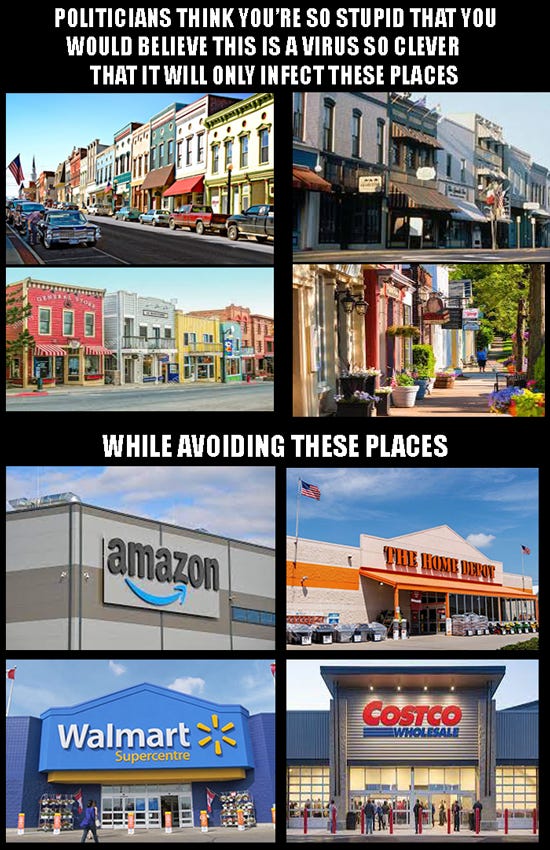The controlling elites made many calculated decisions throughout the engineered chaos and hysteria - and ALL were to their own financial benefit. They determined that the virus was so smart, it simply knew to infect only small businesses owned by the unsophisticated class and to stay out of big box retailers like Walmart, Costco, Home Depot and all the Amazon warehouses. Doubtless these big box retailers’ army of lobbyists showed lawmakers evidence of The Science™ and all its peculiar and contradictory anomalies that justified their absolution from lockdown restrictions and delegated status as ‘essential services’, political contributions notwithstanding.