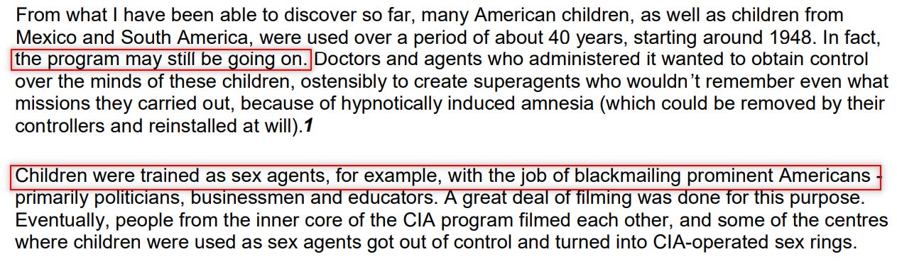 This is the crux of the situation. If anyone doubts the truth (and pervasive., ongoing) statements about MK-Ultra check out Bitchute or your favorite alternative channel, type in MK Ultra, hit search and get ready to get mad. (And I do not mean simply angryβ¦)