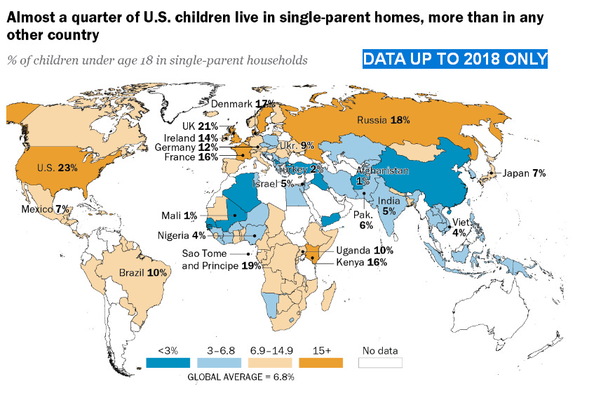 As of 2018, the poverty rate for single-mother families was 34 percent, nearly five times more than the rate of 6 percent for married-couple families.