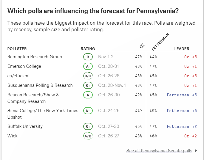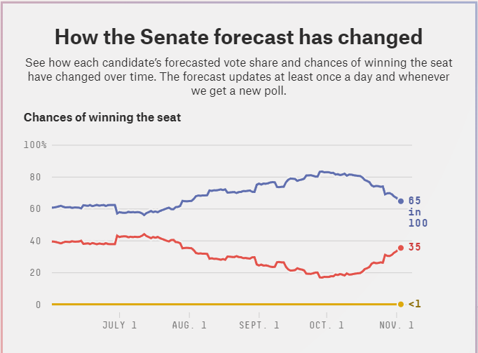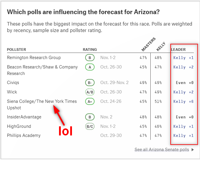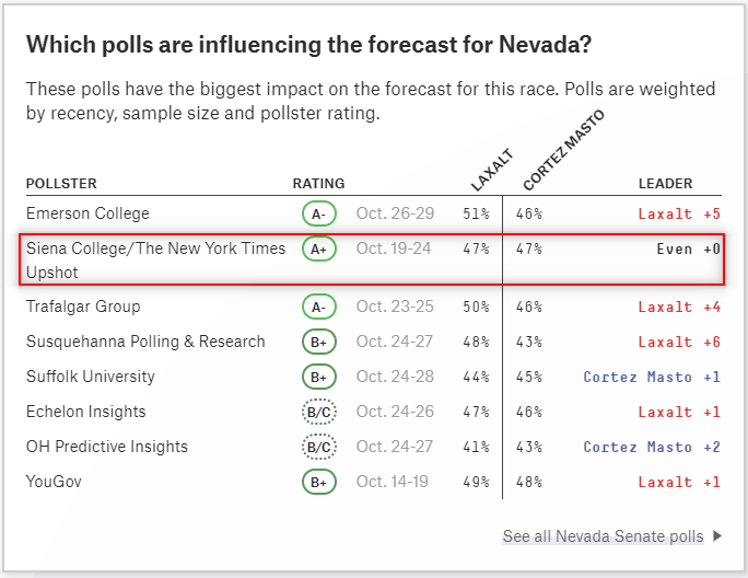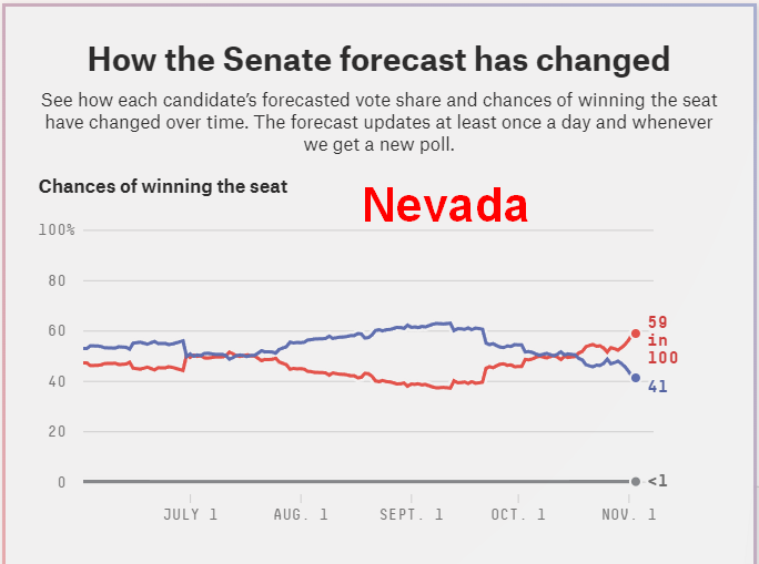 This race has been dominated by Democrat incumbent Catherine Cortez-Masto for months with Adam Laxalt passing her down the final stretch. The uber nerds without access to Barbers at Five Thirty-Eight dot com have Laxalt a 59% favorite to make it to the wire by a head but polling leaves just enough doubt to fool the gallery in a photo-finish that drags out the vote-counting for weeks and keeps Cortez-Masto in the Senate. The last poll by reputable Emerson College shows Laxalt with a commanding lead, but the New York Times poll prior shows a dead heat. The fix will definitely be in, again, in Nevada, if Laxalt doesnโt win.