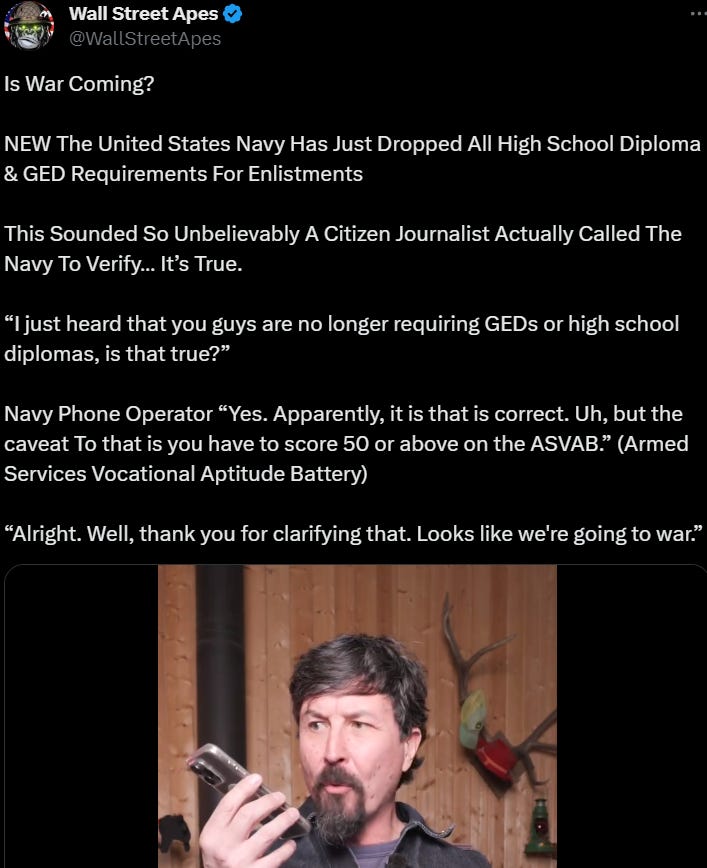 If you want to know what all those young military-aged men will be used for, the Navy just eliminated high school GED requirements for recruitment. Theyβre going to turn the entire Empireβs strike force into a French Foreign Legion, but theyβll probably double the service year requirement.