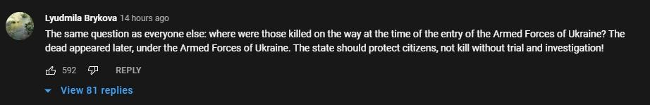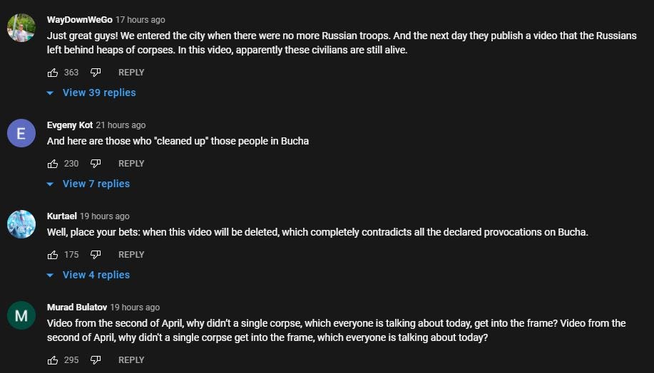 Here is a video of the Ukrainian Security Forces arriving in Bucha two days before the western headlines showed bodies and corpses lying in these same streets. Russian forces had left the area. Curiously none of the civilians on camera mention these atrocities, the mass graves, the corpses in the streets, or any of these Russian βgenocideβ accusations blasted across western corporate-state propaganda sites all weekend. This youtube video has half a million views and will likely get taken down when more people in the west start asking uncomfortable questions that refute the dominant narrative presently driving the βgenocideβ hysteria.