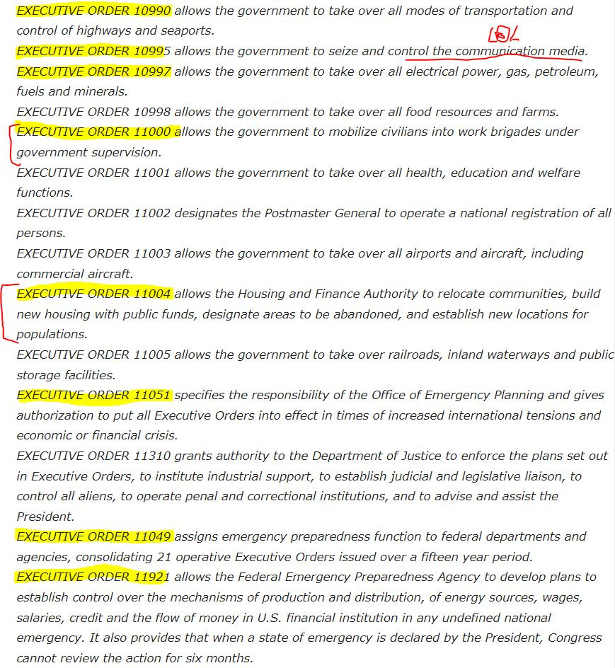 A litany of Executive Orders already established the groundwork for this transition to tyranny in the event of an “emergency”: