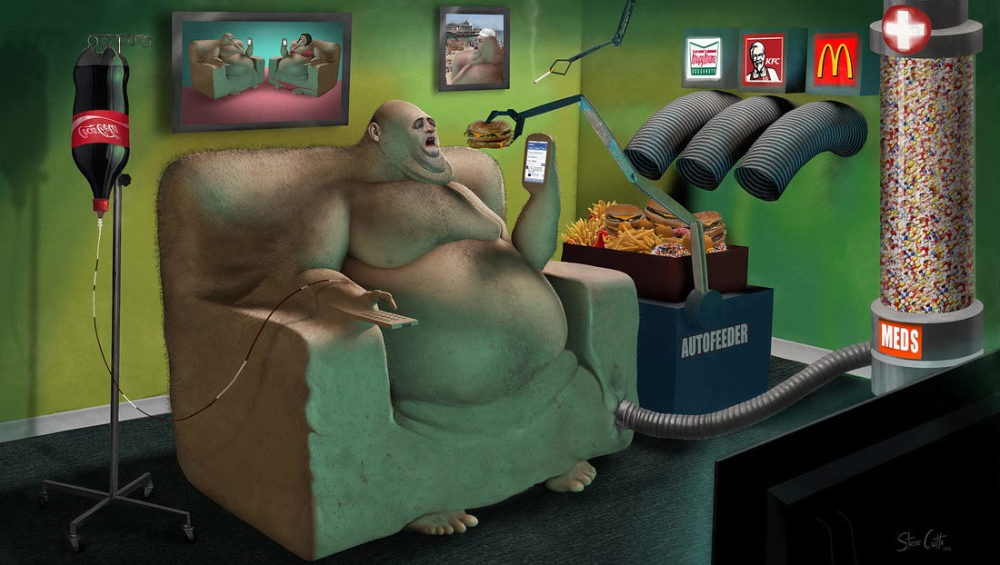 A social body reared on passive sedentary engagements that are increasingly artificial, abstract and disconnected from a grounding in the physical world is an underestimated source of present social Ills. The desires of an android billionaire to shuffle the herd into an even more artificial and disconnected โmetaโ world should raise red flags for even the simple dupes. We know from the psychological literature that digital engagements, algorithmically engineered to capture and extract the attention-labor of billions results in a profound dis-ease at the individual level manifested through skyrocketing anxieties and health ailments. A perpetually anxious state in a individual requires pacification through re-engagement with the source of the anxiety, an act that ultimately satisfies temporarily while back loading further maladies as a toll to be paid later.
