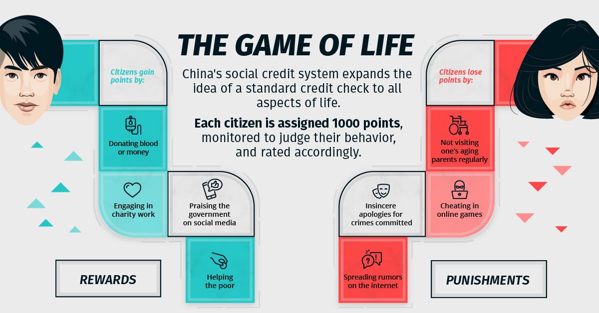 The difference between China and what the west will become if we allow it is not in the details but in the reception. Chinese citizens under authoritarian rule are not autonomous or free to disregard the tyrannical mandates of their rulers. They will learn to love their chains because theyโve been socially engineered to not ask too many questions. There are few carrots and many sticks.
