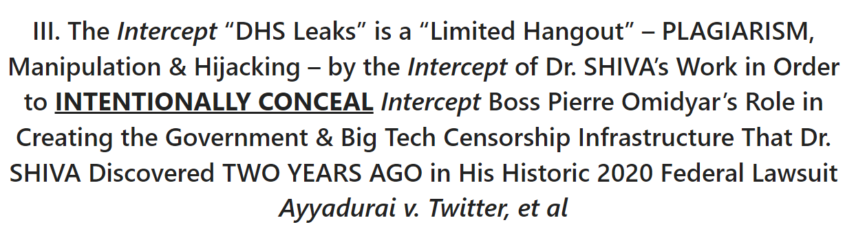 According to Dr. Shiva, The Intercept published the “DHS leaks” earlier this year which revealed what Dr. Shiva’s own legal case and findings already uncovered except they left out that part about their Billionaire owner being a part-time manager at the censorship sausage factory. He claims this is also why Glenn Greenwald refuses to respond to his findings and pushes The Intercept’s “DHS Leaks” trimmed-down version instead.