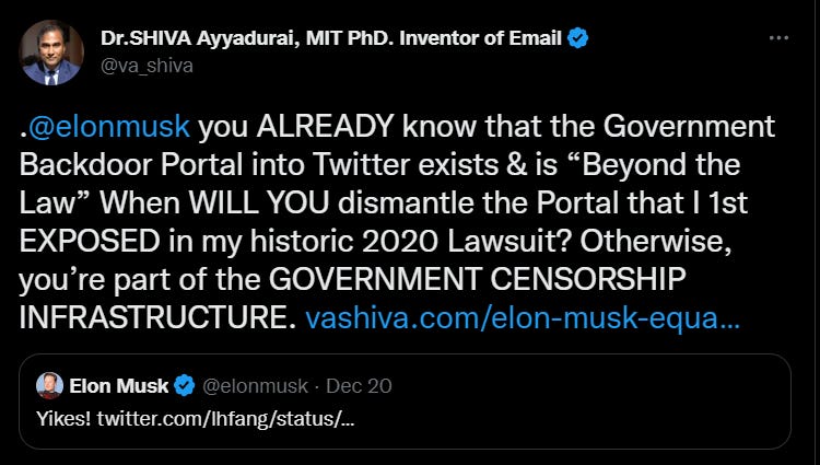 More on Shiva Ayyadurai’s findings later. Back to our fren Elon.