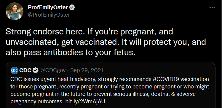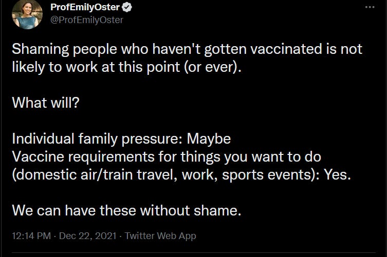 Emily Oster is such a devoted midwit to regime tyranny, she is capable of simultaneously virtue signaling (no shaming others) while championing the use of coercive and dehumanizing discriminatory measures to get those deadly toxins injected into as many bodies as possible who didnโt want them.